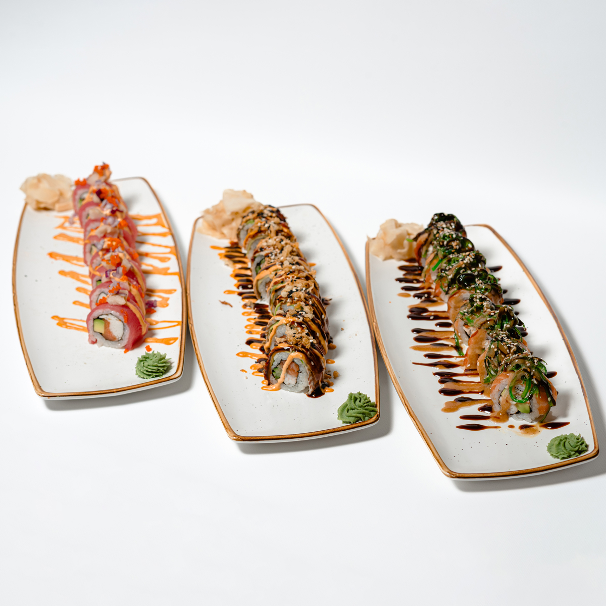 рол Мафіозі, рол з креветкою та стружкою тунця, рол з лососем та авокадо